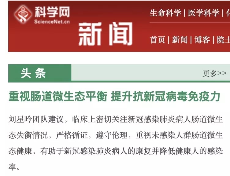 中国科学报发文强调重视肠道微生态平衡,提升抗新冠病毒免疫力,刘星吟团队建议:临床上密切关注新冠感染肺炎病人的肠道微生态失衡情况。